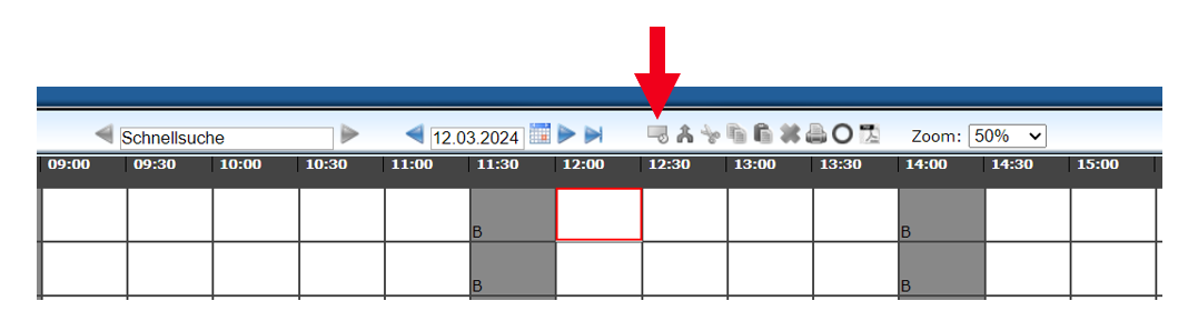 Der Terminplan ist offen (= Buchungsfelder sind "weiß" hinterlegt, aber der Button "Buchen" ist deaktiviert - Hinweis: wenn aktiviert, ist dieser "blau"):